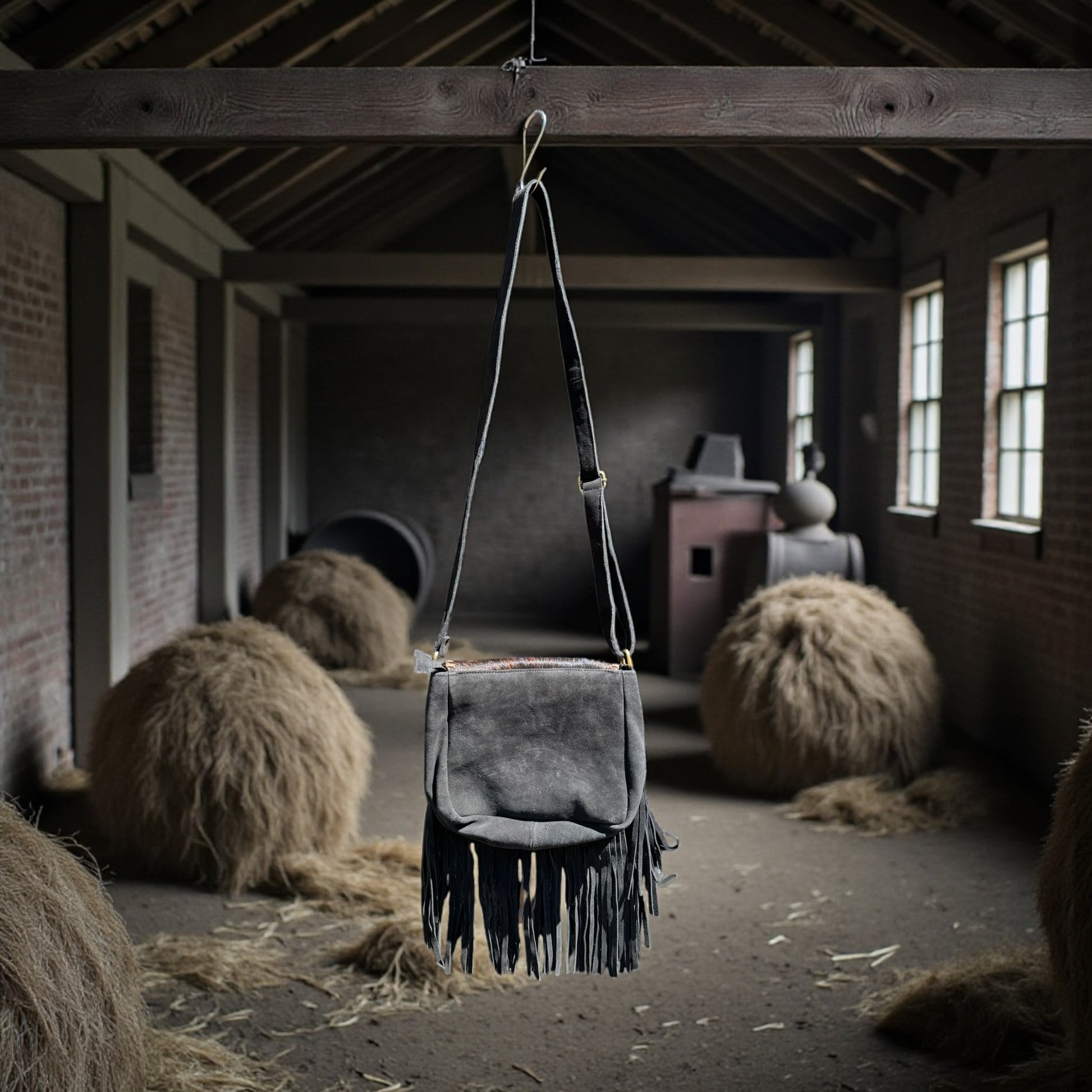 Boho Chic Cowhide Fringe Crossbody Bag with Turquoise Stone Accent